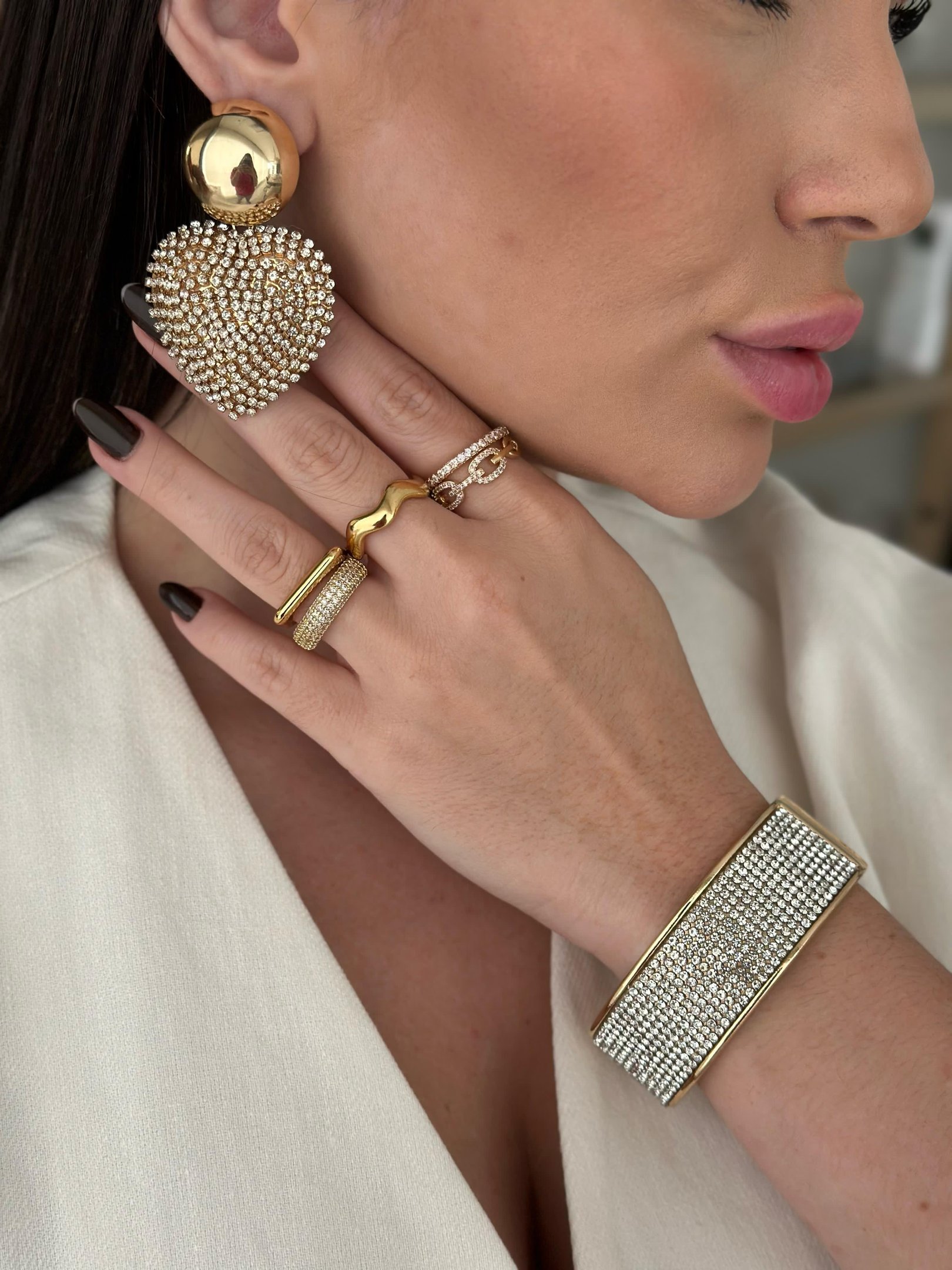 Dica de uso: Combine com colar delicado ou use sozinho para um visual mais minimalista. Ideal para compor looks românticos, sofisticados ou modernos.