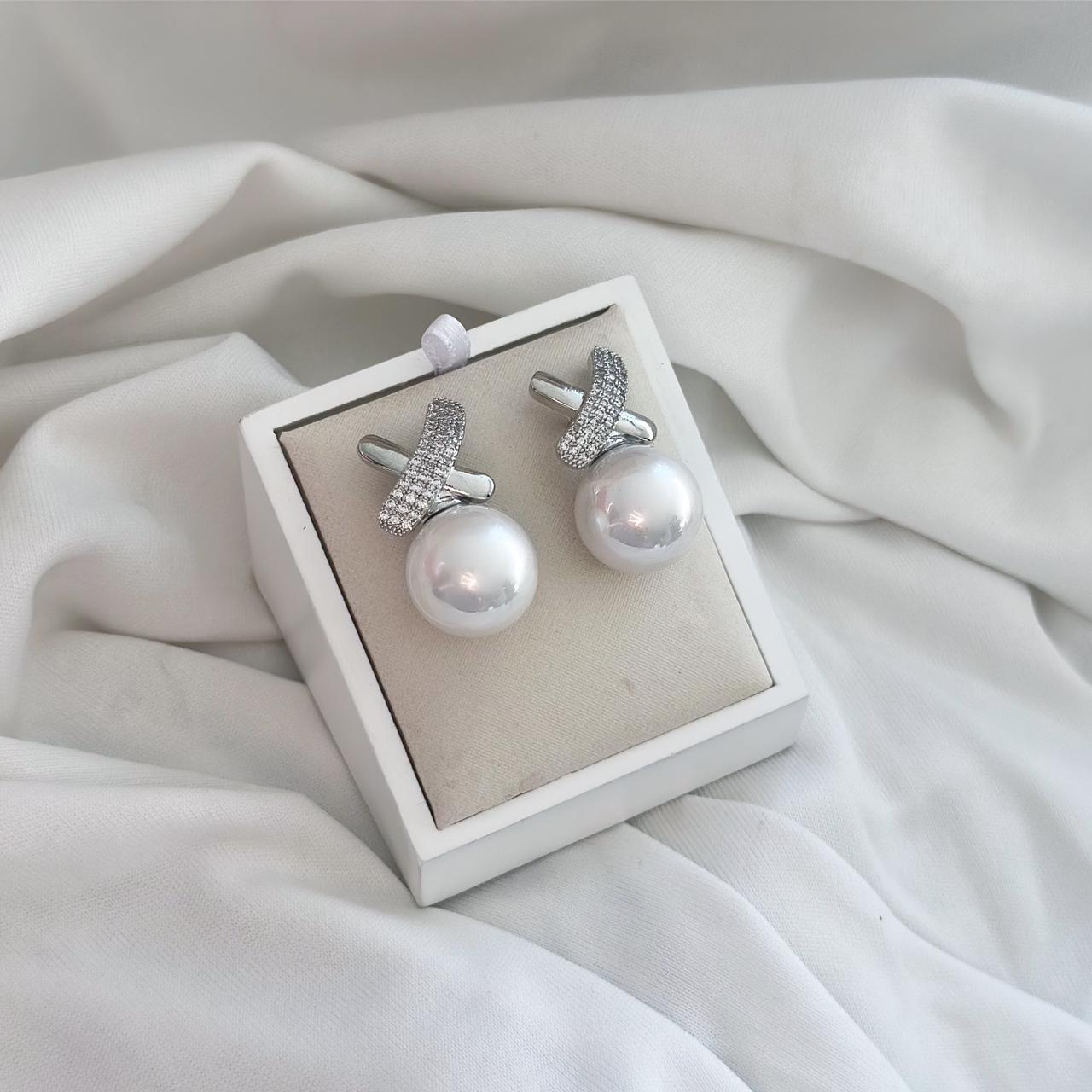 Brinco Folheado a Prata Pérola Detale Cravejado e Liso